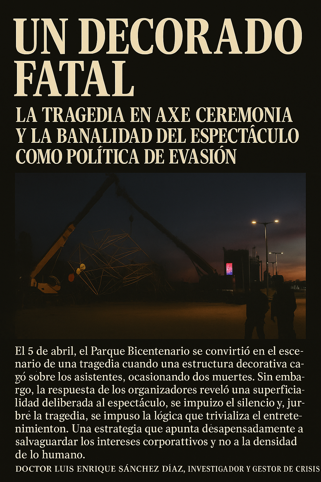 El 5 de abril de 2025, el Parque Bicentenario —uno de los pocos respiros de concreto reciclado en la Ciudad de México— se convirtió en el escenario de una tragedia anunciada. Dos personas murieron aplastadas por una estructura decorativa movilizada por una grúa durante el festival AXE Ceremonia. El desplome no sólo expuso las fallas estructurales de un evento cultural, sino la precariedad sistémica con la que se gestionan las crisis en este país: una mezcla de comunicados vacíos, tecnocracia ornamental y una estética de la impunidad perfectamente calibrada.